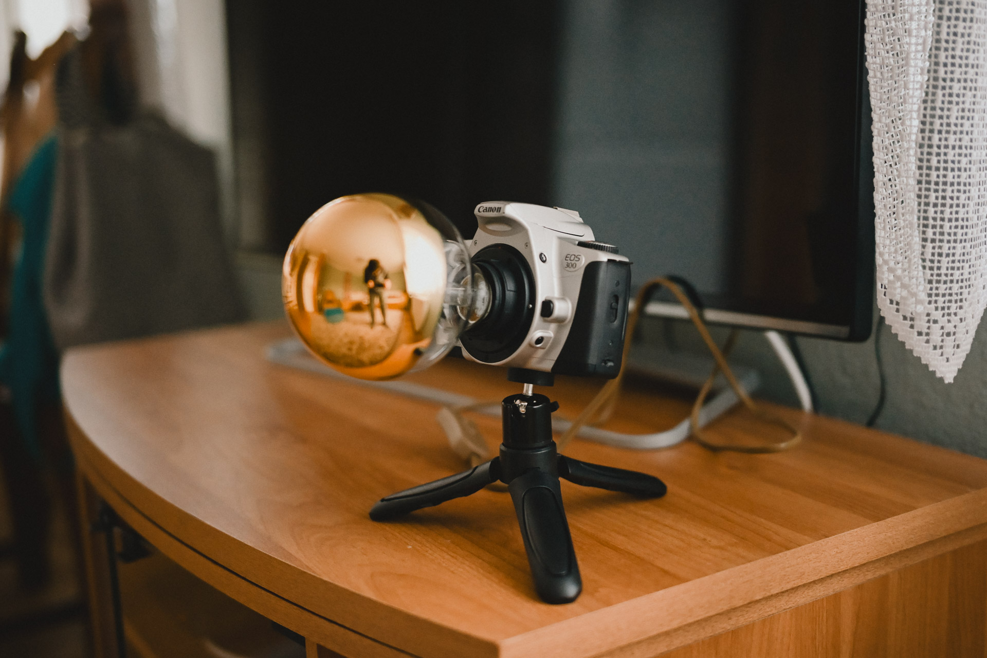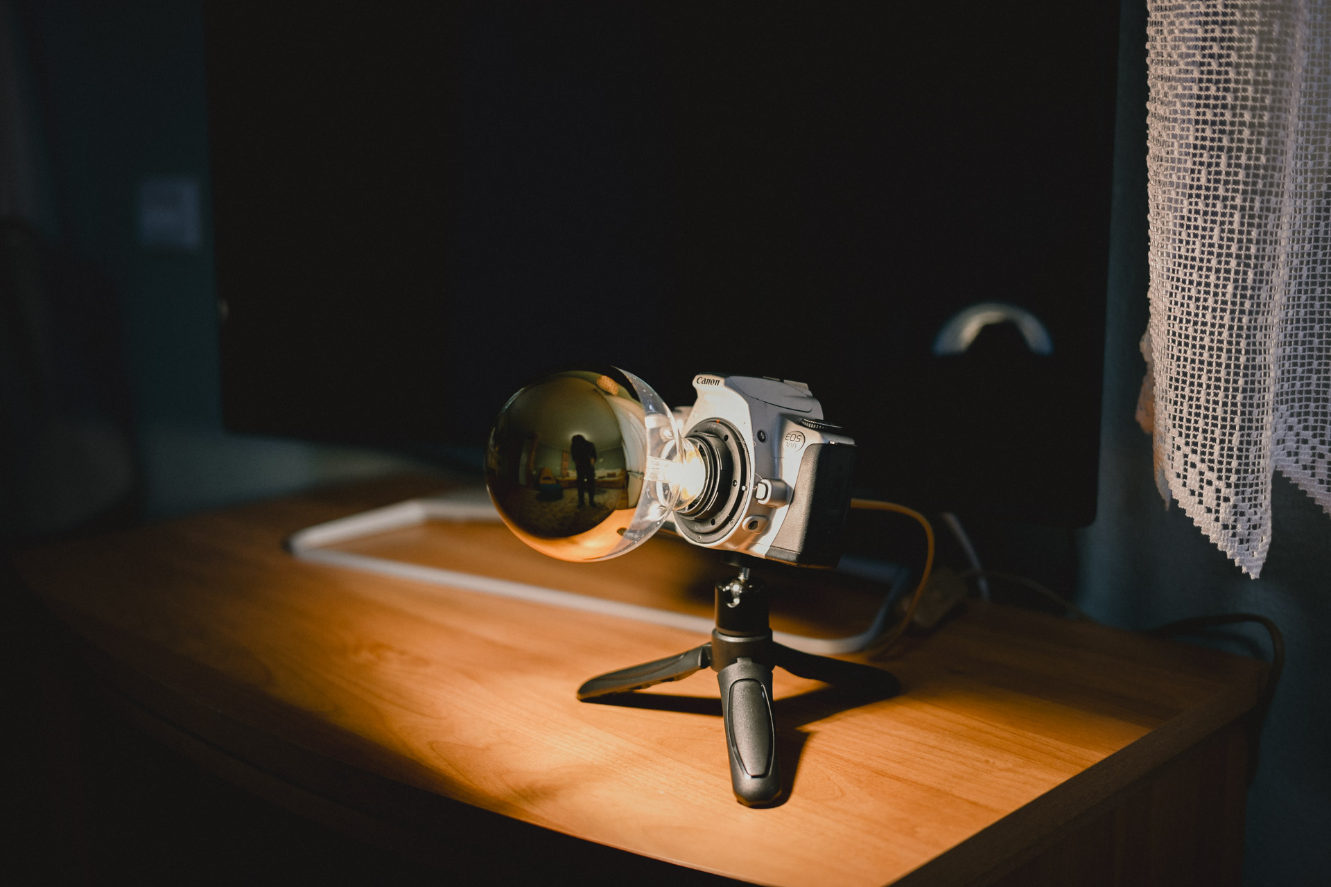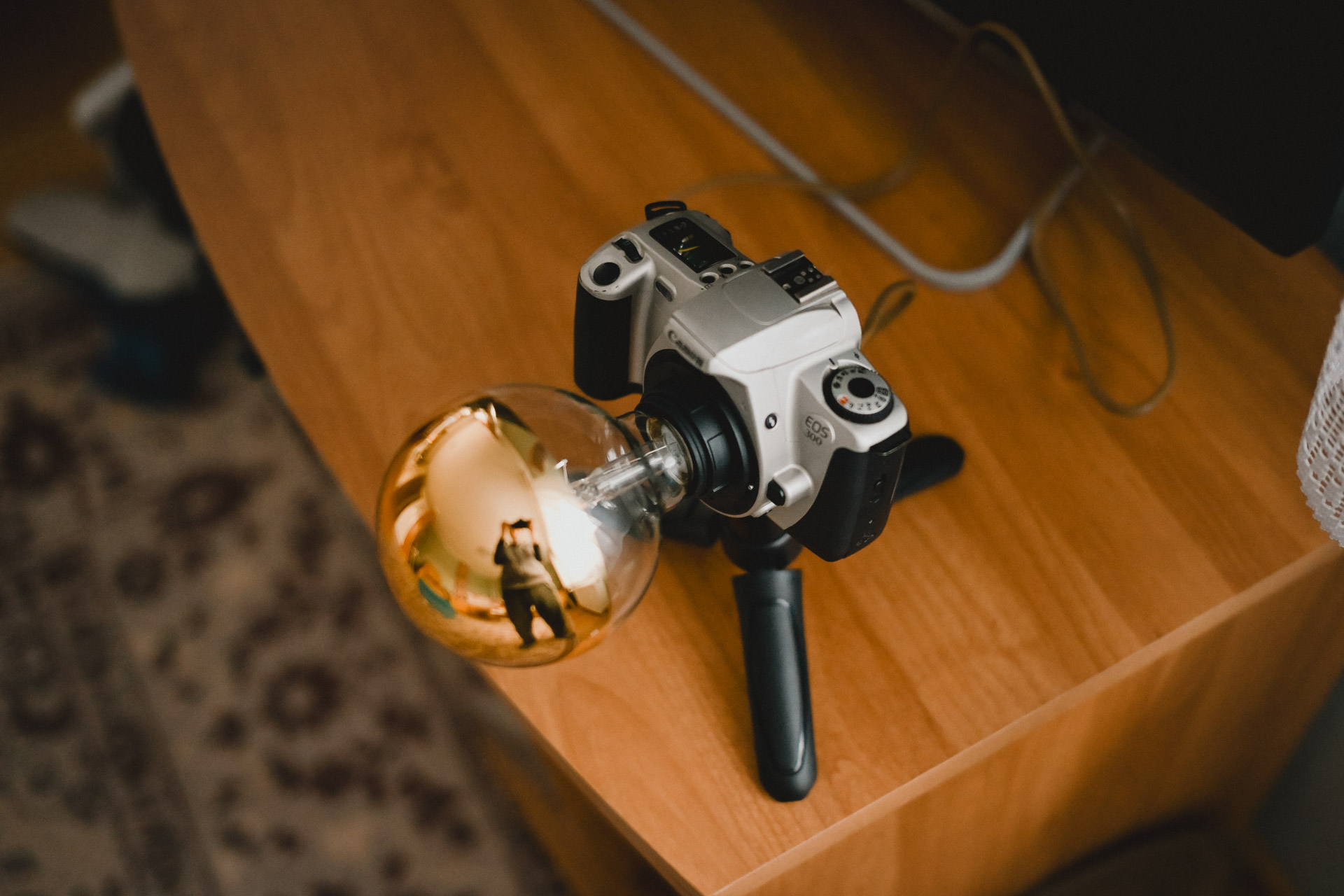 Unikatna lampa od starog Canon analognog fotoaparata sa sijalicom koja reflektira svjetlo nazad prema aparatu. Dolazi sa podesivim stolnim tripodom.