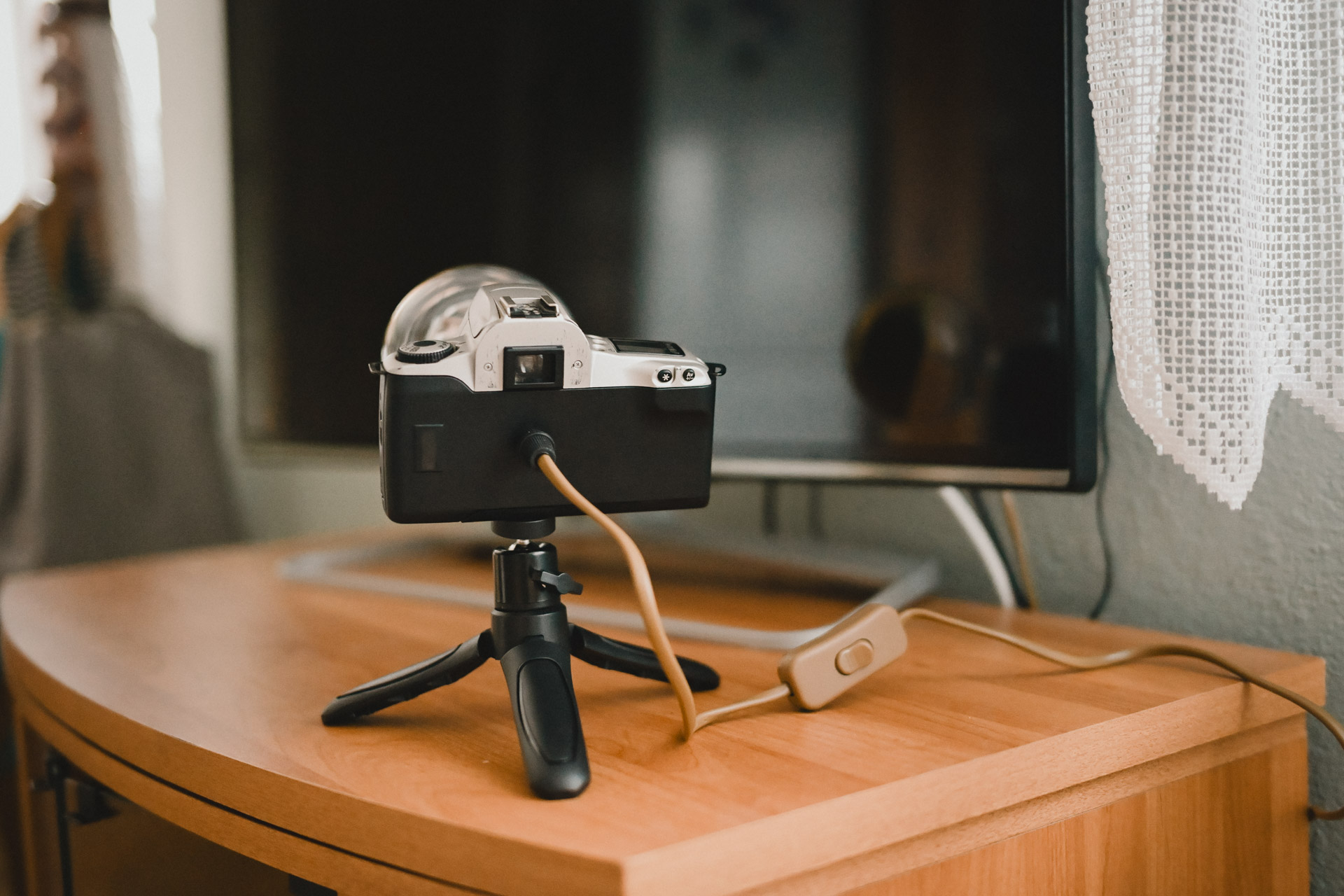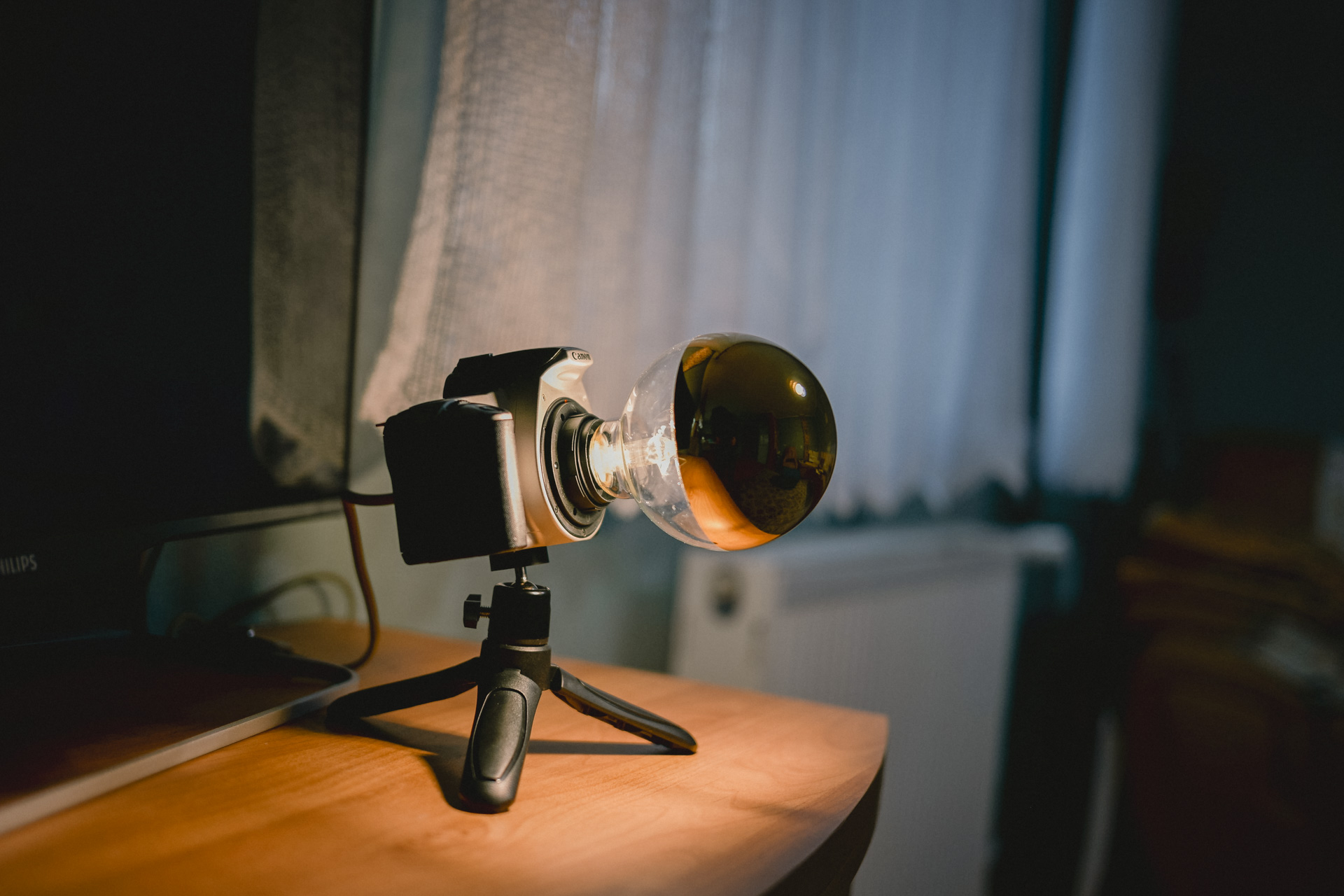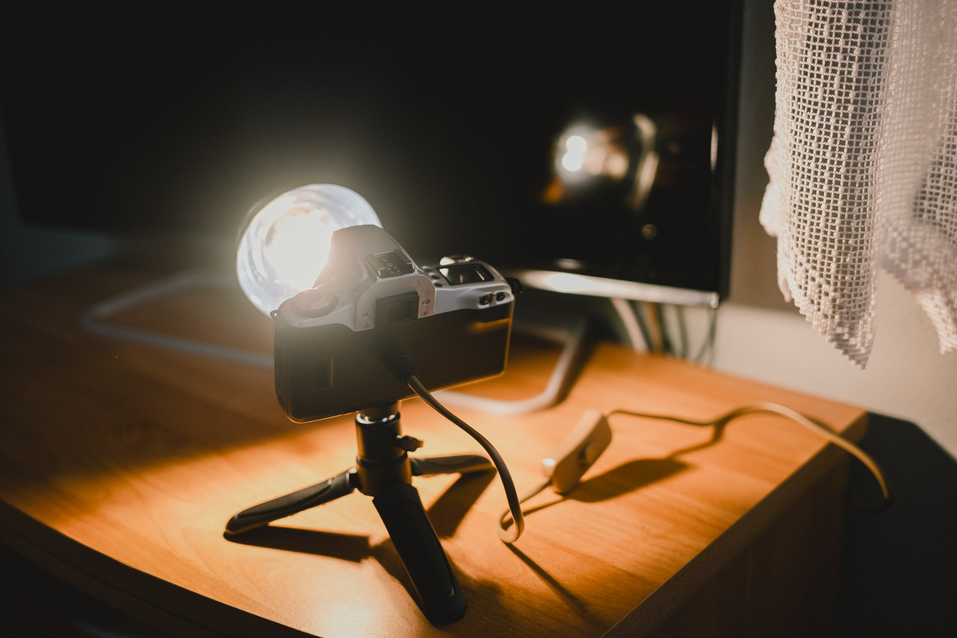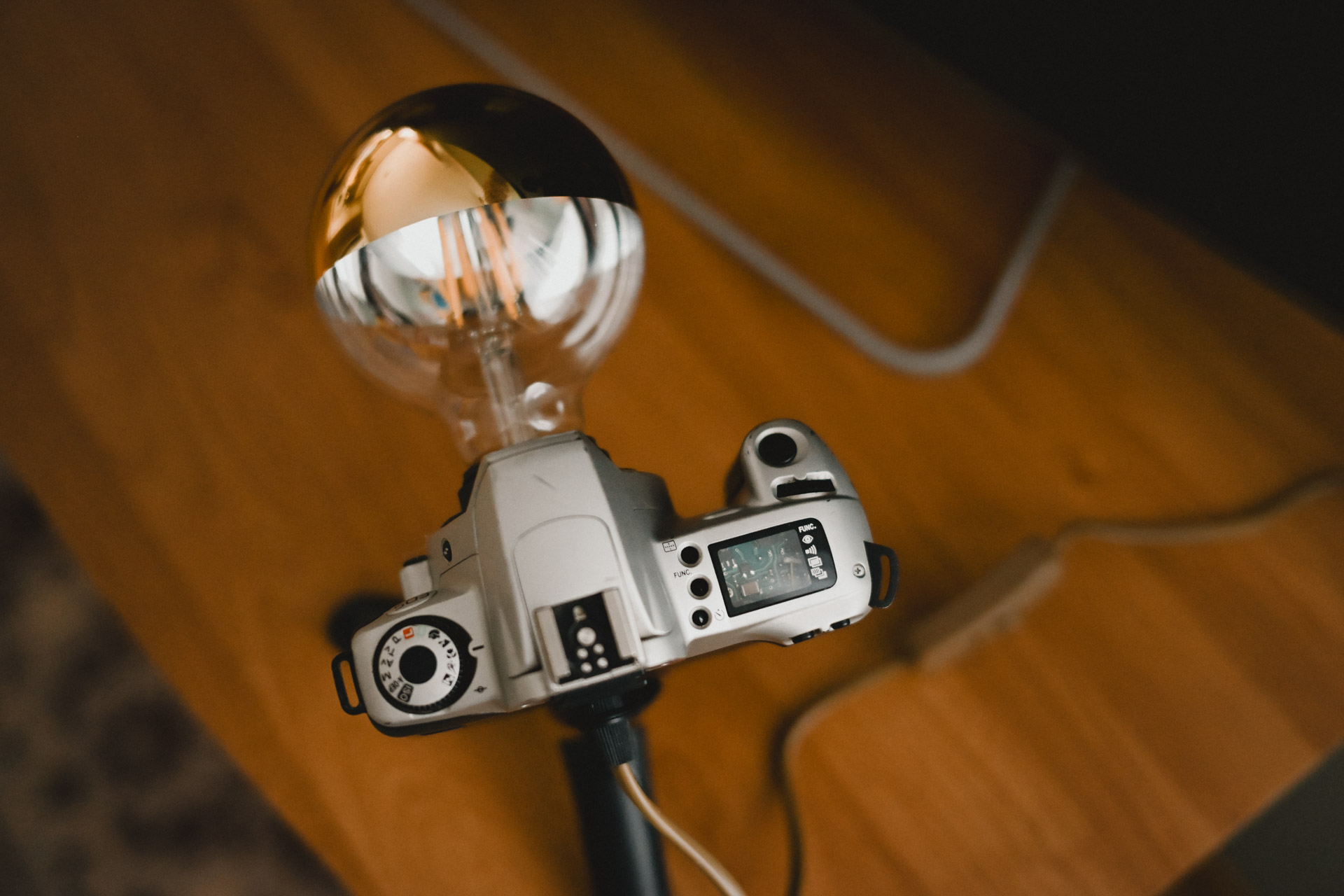 Unikatna lampa od starog Canon analognog fotoaparata sa sijalicom koja reflektira svjetlo nazad prema aparatu. Dolazi sa podesivim stolnim tripodom.